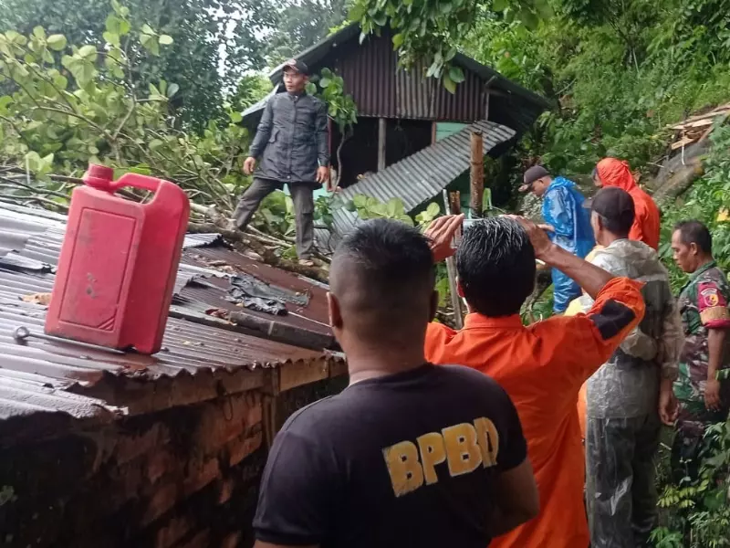 Sebatang pohon Sikalabuk dengan panjang ±15 meter dan diameter ±60 cm tumbang dan menimpa rumah milik Izhar (63), seorang nelayan.