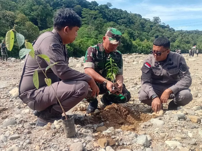 Kolonel Inf Ferry Adianto menjawab, jenis pohon yang ditanam di antaranya durian, petai, dan jengkol, serta tanaman bambu yang berfungsi menahan erosi.